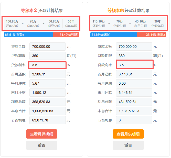 举个例子,100万的房子,银行贷款70万,本金和利息按30年计算,大约107万(本金70万+利息37万)。
