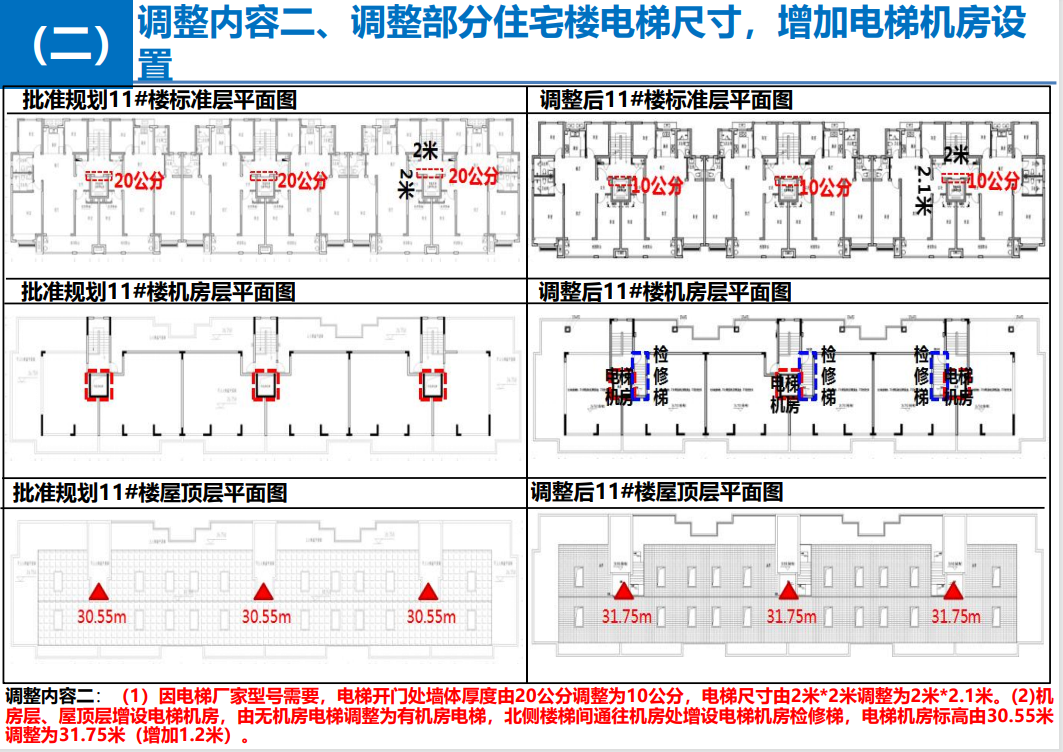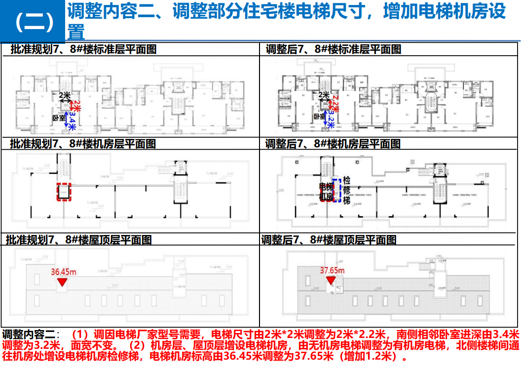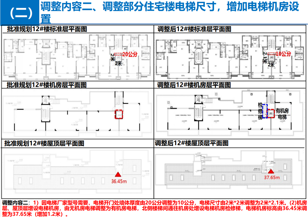 调整内容二、调整部分住宅楼电梯尺寸,增加电梯机房设置,涉及的楼栋有4-5#、7-8#、11-12#楼。
