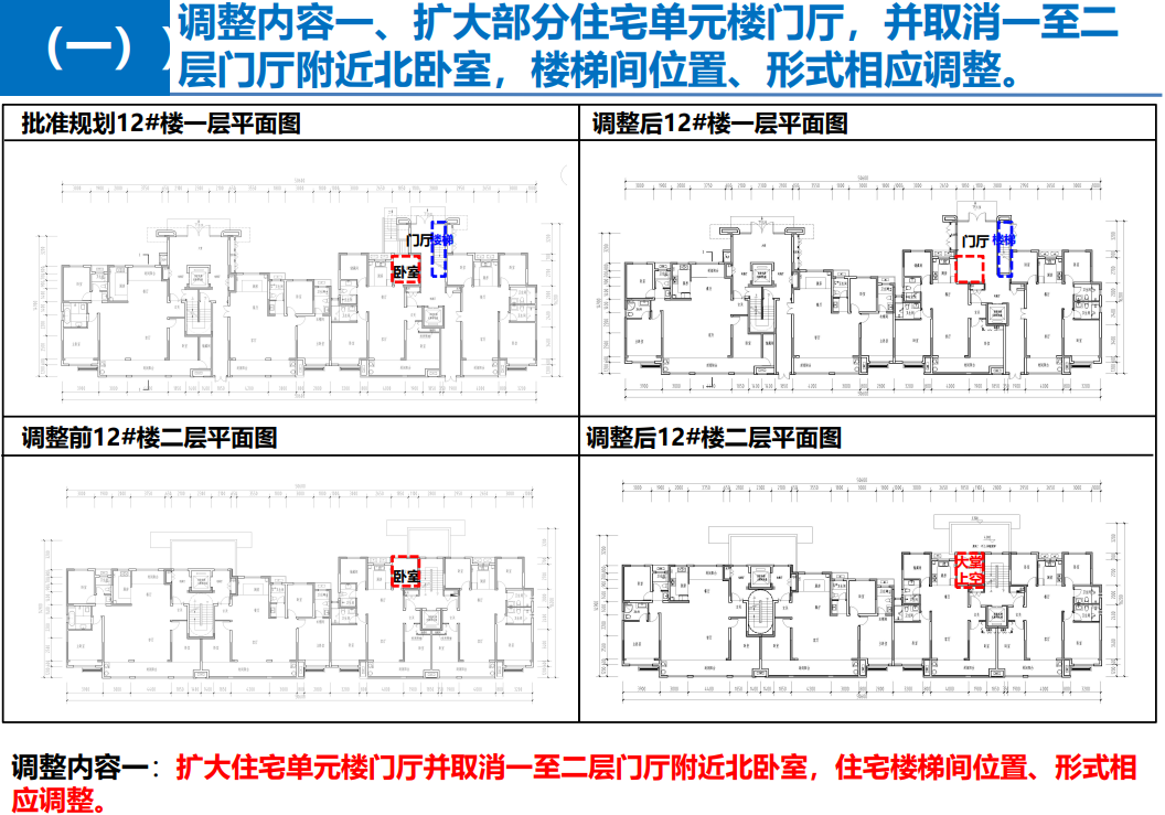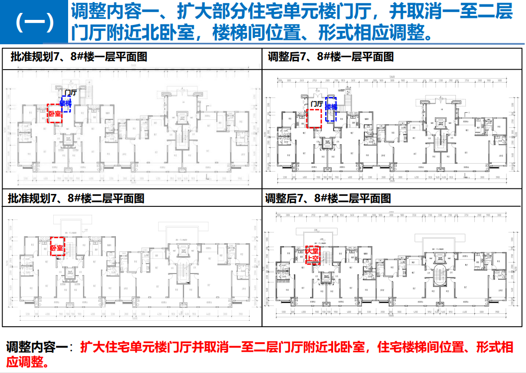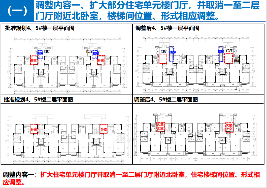 调整内容一:扩大部分住宅单元楼门厅,并取消一至二层门厅附近北卧室,楼梯间位置、形式相应调整。涉及的楼栋有4-5#、7-8#、11-12#楼